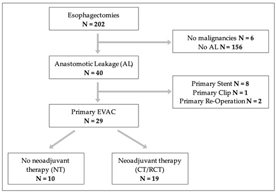 - Seika, P.; Biebl, M.; Raakow, J.; Berndt, N.; Feldbrügge, L.; Maurer, M.M.; Dobrindt, E.; Thuss-Patience, P.; Pratschke, J.; Denecke, C. The Association between Neoadjuvant Radio-Chemotherapy and Prolonged Healing of Anastomotic Leakage after Esophageal Resection Treated with EndoVAC Therapy. J. Clin. Med. 2022, 11, 4773. [Google Scholar] [CrossRef]