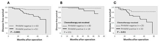 | RHAMM | positive/negative | 0.018 | 3.8 (1.3–11) | 0.01 | 4.4 (1.4–14) |