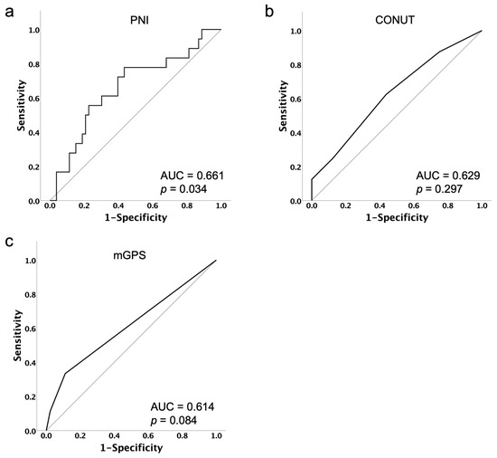 Receiver operating characteristic curves of PNI (a), CONUT (b) and mGPS (c) with respect to the prediction of treatment discontinuation due to PARPi-related AEs. The optimal cut-off was identified using the Youden Index from the ROC analysis as 48.44 for PNI, 2 for CONUT and 1 for mGPS.