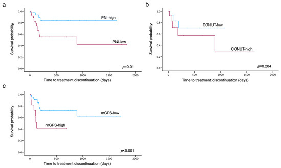 Kaplan–Meier curves for TTD were generated for each nutritional assessment indicator. The log-rank test showed that TTD was significantly shorter in the low-PNI and high-mGPS groups (p = 0.01, p < 0.001) (Figure 3).