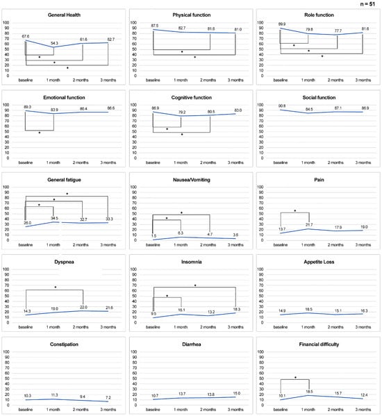 Notably, HRQoL scores of five functional domains (general health, physical function [PF], role function, emotional function, and cognitive function (CF)) and six symptoms (general fatigue, nausea, pain, dyspnea, insomnia, and financial difficulties) significantly worsened during the first 3 months. There were no significant changes in appetite loss, constipation, or diarrhea (Figure 1).