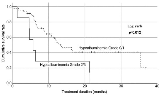 Grade ≥2 hypoalbuminemia at 3 months was associated with shorter treatment duration (hazard ratio (HR), 3.39; 95% CI, 1.30–8.84; p = 0.01) (Table 5). According to the log-rank analysis, more than grade 2 hypoalbuminemia showed shorter treatment duration than no hypoalbuminemia or grade 1 hypoalbuminemia (Figure 2).