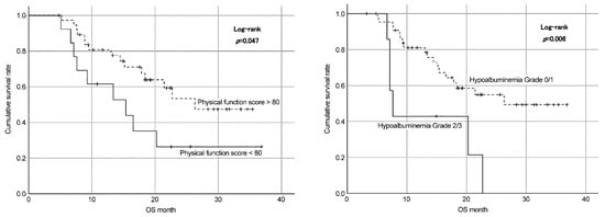 Age- and sex-adjusted multivariate analysis revealed that patients with baseline des-gamma-carboxy prothrombin (DCP) levels of >1000 mAU/mL had shorter OS than those with lower DCP levels. Meanwhile, grade ≥2 hypoalbuminemia at 3 months was associated with shorter OS (HR, 3.39; 95% CIs, 1.30–8.84; p = 0.01). In addition, maintaining a physical function score of ≥80 points at 3 months after the initiation of treatment was essential to achieve a better prognosis (HR, 0.37; 95% CIs, 0.15-0.87; p = 0.02) (Table 6). According to the log-rank analysis, more than grade 2 hypoalbuminemia and physical function scores less than 80 showed shorter OS (Figure 3).