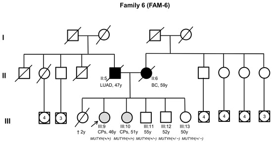 Family pedigree of family 6. Squares indicate men; circles indicate women. Squares and circles with a number inside represent multiple individuals. The arrow indicates the index case. Black-filled symbols denote individuals with cancer, gray-filled symbols indicate individuals with colorectal polyps (CPs), and unfilled symbols correspond to individuals without cancer. Slashed symbols denote dead individuals. The following information is given for specific individuals: clinical manifestations (LUAD = lung adenocarcinoma, BC = breast cancer), age of death (†), age of onset of clinical manifestations, or age at genetic testing (y = years). The zygosity of MUTYH pathogenic variants (PVs) is also shown (MUTHY+/− = heterozygous PV; MUTYH +/+ = compound heterozygous PVs).
