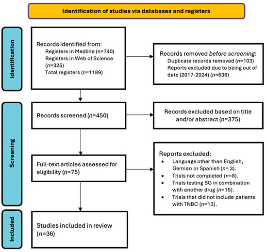 During the initial title and abstract screening, articles written in languages other than English, Spanish, and German were excluded. Clinical trials that were not completed and were in the recruitment phase or did not have final statistical results as of 20 March 2024. In addition, other articles that compared SG with new immunotherapies or treatments other than standard chemotherapy were discarded. Articles that evaluated SG in the context of other drugs compared with chemotherapy were discarded because this systematic review evaluates SG in monotherapy. Also excluded were those that evaluated the results of the drug in cancers other than TNBC, even if they were Her2neu or hormone receptor-positive (HR+) CM. In the full-text article review phase, we excluded letters to the editor, personal opinions, books, book chapters, non-original reports, single cases, editorials, commentaries, or articles that did not contribute to or complement the objectives of the review.