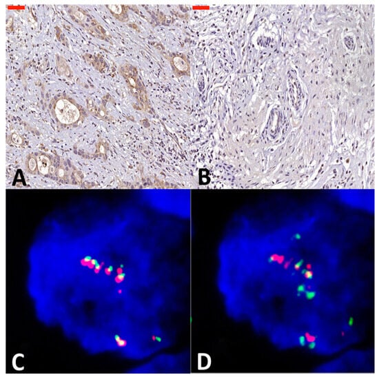 Representative specimen of esophageal squamous cell carcinoma showing (A) a high- and (B) a low-FGF8-expressing tumor section. The bar corresponds to 50 µm. Original magnification ×400 for both. (C) Esophageal squamous cell carcinoma with ALK gene amplification (red and green fusion signals flanking the ALK gene). (D) Specimen identical as C showing EML4 amplification in turquoise. (C and D: usage with permission from Elsevier and Copyright Clearance Center (Schoppmann SF et al., 2013 [21])).