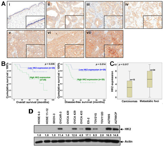 Up-regulated HK2 in ovarian cancer is linked to tumor metastasis and poor survival. (A) Immunohistochemical staining of HK2 in mucinous benign cystadenoma (i); mucinous (ii), endometrioid (iii), and clear cell (iv) carcinomas; primary serous carcinomas (v); and matched metastatic foci (vi) and (vii). Magnification: 20×. The insets highlight regions with higher magnification. (B) Kaplan–Meier overall (left panel) and disease-free (right panel) survival curves for ovarian cancer patients with low and high HK2 expression levels (cut-off at mean). (C) HK2 immuno-scoring in primary carcinomas and corresponding metastatic foci. (D) HK2 protein expression in normal ovarian epithelial cell lines (HOSE) and ovarian cancer cell lines as assessed by immunoblot analysis. Densitometric analysis is shown normalized to Actin.