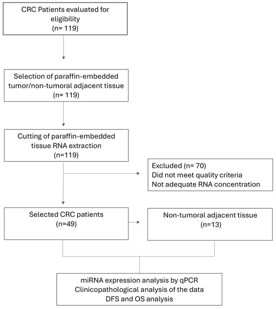 A total of one hundred and nineteen patients treated at the Gastrointestinal Functional Unit were selected for collection of paraffin-embedded tumor/non-tumoral adjacent tissue and RNA extraction from paraffin-embedded tissue. Seventy patients were eliminated because the tissue did not meet quality criteria and/or did not have enough RNA concentration. A total of forty-nine CRC tissues and thirteen non-tumoral adjacent tissues were selected for miRNA expression analysis by qPCR, clinicopathological analysis, DFS, and OS analysis considering miRNA expression levels (Figure 1).