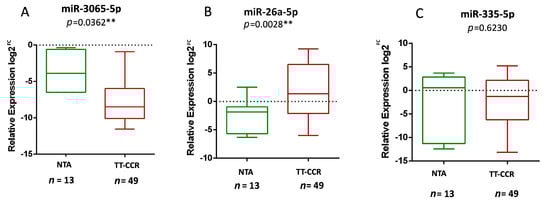 Comparison of miRNA expression levels between non-tumoral adjacent tissue (NTA), and CRC tissues (TT-CRC). The relative expression of (A) miR-3065-5p, (B) miR-26a-5p, and (C) miR-335-5p are shown. The relative expression of miRNAs was calculated using 2−ΔCT analysis using RNU6 levels as an endogenous expression control. ** Statistical significance.