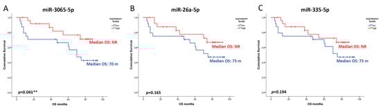 To explore the potential predictive value of miR-3065-5p, miR-26a-5p, and miR-335-5p in OS in CRC, only CRC patients (n = 49) were considered. The median expression of miR-335-5p, miR-3065-5p, and miR-26a-5p was calculated and subdivided into two groups: (1) high and (2) low expression. Overall survival analyses were performed considering the expression levels of each miRNA. Patients with low expression of miR-3065-5p had a median OS of 70 months, while patients with high expression of the miRNA did not reach the median OS. A 5-year OS of 66% vs. 80% for low and high expression was observed (p = 0.041) (Figure 3A).