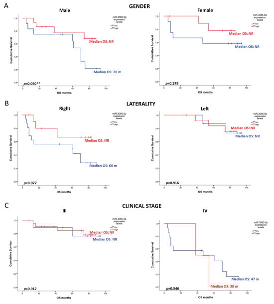Clinical features and overall survival (OS) association with miR-3065-5p levels. Kaplan–Meier estimates the overall survival of patients with CRC, correlating clinical features and miR-3065-5p expression levels (median expression log 2−ΔCT = 2.5). (A) Gender, (B) laterality, and (C) clinical stage. Median OS not reached (NR). ** Statistical significance.