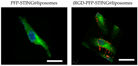 4T1 cells incubated with PFP-STING@liposomes and iRGD-PFP-STING@liposomes. DiI-labeled liposomes (red), DAPI showed blue fluorescence (cell nucleus), DIO-labeled cell membrane (green) Scale bar: 10 µm.