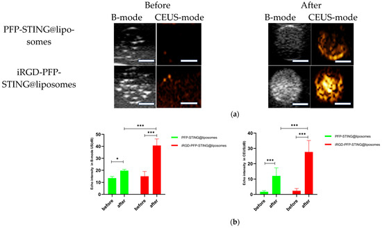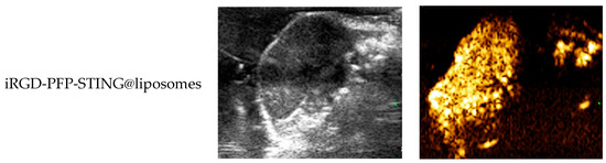 In vivo ultrasound imaging. The US and CEUS imaging pictures of PFP-STING@liposomes and iRGD-PFP-STING@liposomes obtained at 13 min post-injection. LIFU was applied for 3 min in 4T1 breast cancer xenograft model mice.