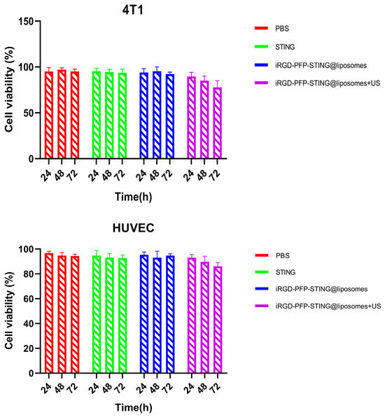 4T1 cell and HUVEC cell viabilities after incubation with PBS, STING, PFP-STING@liposomes, and iRGD-PFP-STING@liposomes+US for 24, 48, and 72 h with or without LIFU irradiation.