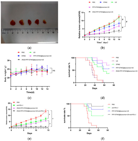 In vivo anti-tumor and therapeutic evaluation. (a) Photographs of 4T1 tumor tissues collected at the end of treatment from the PBS, US, STING, PFP-STING @liposomes + US, and iRGD-PFP-STING @liposomes +US groups, respectively. (b,e) Relative tumor volume changes of the mice after various treatments. (# p < 0.001, n = 5). (c) Body weight changes of the mice after different treatments. (d,f) Survival curves of mice in different treatment groups over 70 days (n = 10).