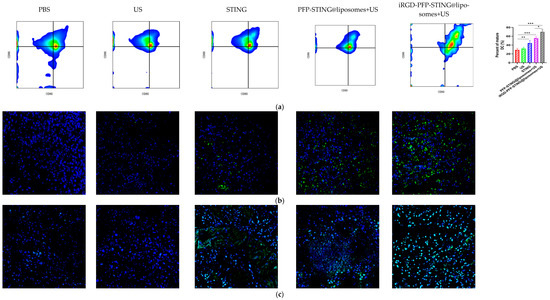 The transmission electron microscopy (TEM) images confirmed the spherical morphology of the liposomes (Figure 1a,b). The constructed liposomes successfully underwent a phase transition into microbubbles when irradiated with ultrasound, resulting in liposomal membrane rupture and subsequent drug release (Figure 1c,f). The particle size distributions of the control and STING liposomes were 212.25 ± 15.37 nm and 232.16 ± 19.82 nm, respectively, with no significant difference (p > 0.05) (Figure 1d). The corresponding zeta potentials for the control and STING liposomes were −21.26 ± 5.64 mV and −27.47 ± 6.25 mV, with no significant difference (p > 0.05) (Figure 1e). The liposomes showed good stability after one week of storage in PBS at room temperature in comparison with the freshly prepared samples (Figure 1g). The liposomes were incubated in plasma at 37 °C, and no phase changes were observed under an optical microscope, indicating their stability at this temperature. When stored at 4 °C, the liposomes exhibited minimal spontaneous decomposition, with over 95% remaining intact after one week. The encapsulation efficiency of STING in the liposomal formulation was found to be 42.3%. The measured sizes of the control and STING liposomes were 228.61 nm and 248.92 nm, respectively. The results from the TEM images indicated that the addition of iRGD had minimal impact on the particle size distribution of the liposomes. Furthermore, the size of the liposomes met the criteria for the enhanced permeability and retention (EPR) effect, making them suitable for both passive and active targeting of tumor tissues. Zeta potential is a critical factor in assessing the stability of nanoparticles with a negative value indicating excellent stability, which is advantageous for biopharmaceutical applications.