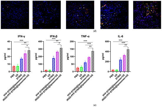 Section staining analysis on the tumors of mice bearing 4T1 breast cancer was performed on the 5th day after five cycles of treatment to study the immune cells. Targeted therapy using ultrasound irradiation led to a significant increase in the infiltration of CD8+ T lymphocytes (CTLs). To further investigate the impact on systemic anti-tumor immunity, flow cytometry analysis was performed on dendritic cells in the tumor-sentinel lymph nodes of mice. Under treatment with ultrasound irradiation, the maturation and activation of DC cells in the lymph nodes of 4T1 tumor-bearing mice in the targeted liposome group increased by 34.2% (Figure 8a). Furthermore, in mice treated with STING agonists combined with liposomes and ultrasound irradiation, the improvements in maturation and activation rates were 12.5% and 24.3%, respectively. These results indicated that ultrasound irradiation of the targeted liposomes enhanced anti-tumor immunity by promoting the infiltration of immune cell populations, particularly CTLs, into tumors (Figure 8b,d). The targeted liposome group showed a significantly enhanced natural immune-killing effect within tumor tissues, as evidenced by the NK cell infiltration analysis in tumor sections. Breast cancer tissues were collected for immunofluorescence analysis, using CD49b and NKG2D as typical markers to assess NK cell activation [53]. The immunofluorescence results showed that the targeted liposome treatment group showed significantly enhanced expression of CD49b (green) and NKG2D (red) in NK cells. The positive proportion of NK cells (CD49b+NKG2D+) was significantly higher than that observed in the other control groups, indicating a considerable expansion and activation of NK cells within the breast cancer tumor microenvironment (Figure 8d). TUNEL staining of tumor slices also indicated the highest proportion of tumor apoptosis in the targeted liposome treatment group, suggesting the excellent tumor cell-killing potential of the targeted liposomes (Figure 8c). The targeted liposomes mice group showed significantly increased serum levels of Th1 cytokines, TNF-α, and IFN-γ, which are typical markers of cellular immunity. Notably, this treatment resulted in marked elevation of IFN-β and IL-6 production, as illustrated in Figure 8e. The stimulation of the STING pathway is known to initiate the synthesis of type I interferons and pro-inflammatory cytokines. Moreover, once activated, NK cells secrete higher levels of TNF-α and IFN-γ. Collectively, these observations suggested that the STING pathway may be a key mediator of NK cell activation induced by liposomal therapy. In conclusion, the evaluation and analysis of immune cells in breast cancer sections indicated that the targeted liposomes developed in this study could transform cold tumors into hot tumors, thereby facilitating effective immunotherapy for breast cancer.