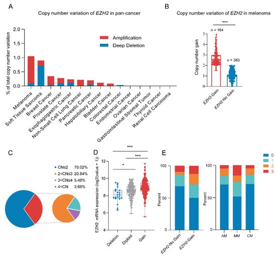 Copy number variation of EZH2 gene in melanoma. (A) EZH2 gain status in different cancer types from the cBioPortal database. (B) Copy number variation of EZH2 gene in 547 melanoma samples. *** p < 0.001. (C) Distribution pie chart of EZH2 copy number (n = 547). According to the EZH2 copy number, it is divided into four subgroups. Subgroup 1: copy number ≤ 2; subgroup 2: 2 < copy number ≤ 3; subgroup 3: 3 < copy number ≤ 4; subgroup 4: copy number > 4. (D) Correlation of EZH2 gain status with its mRNA expression in melanoma samples from the cBioPortal database (n = 367). * p < 0.05, *** p < 0.001. (E) Association of EZH2 copy number gain with expression levels in melanoma subtypes (n = 183). The left panel represents the percentage of cases with or without EZH2 copy number gain across different expression levels (0, 1, 2, 3). The right panel illustrates the proportion of expression levels in different melanoma subtypes: acral melanoma (AM), mucosal melanoma (MM), and cutaneous melanoma (CM). The staining score for each sample, counting the intensity of the staining, was graded as 0, 1, 2, and 3 (“0” as negative, and “3” as the strongest).