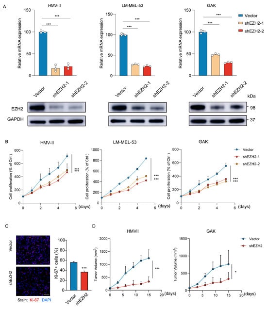 Utilizing the Cancer Cell Line Encyclopedia (CCLE) database [44,45], we found a positive correlation between EZH2 copy number and its expression levels in cells (Supplementary Figure S1A,B). Further analysis in 11 melanoma cell lines revealed that the protein expression levels of EZH2 in cell lines with EZH2 copy number gain (GAK, LM-MEL-53, and A375) were significantly higher than those within the normal range (SK-MEL-5), though not uniformly across all cell lines (Supplementary Figure S1C,D).