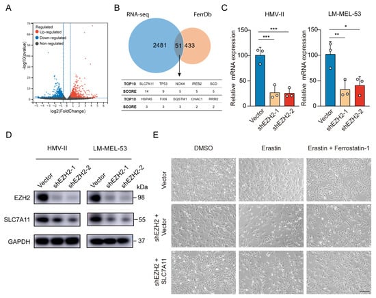 Depletion of EZH2 stimulates ferroptosis through decreased SLC7A11. (A) Volcano plot displaying differential expression from RNA-seq data. Red points indicate upregulated genes, blue points show downregulated genes, and grey points represent genes without significant changes. Vertical dashed lines mark fold change thresholds, and the horizontal line indicates the p-value cutoff for significance. (B) Venn diagram showing the significant overlap between RNA-seq data and FerrDb database. SCORE values were derived from FerrD. The SCORE values were listed below the Venn diagram, with SLC7A11 as the top hit (C,D). The expression of SLC7A11 was detected by RT-qPCR (C) or Western blot assay (D) with EZH2 knockdown. The data are presented as the mean ± SEM. n = 3, * p < 0.05, ** p < 0.01, *** p < 0.001. (E) Representative phase-contrast images of EZH2-depleted LM-MEL-53 cells, with or without SLC7A11 re-expression, treated with 4 μM erastin or 4 µM erastin and 4 µM Ferrostatin-1 (n = 3). Scale bar: 200 μm.