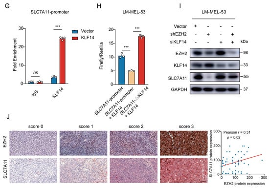 SLC7A11, a cystine transporter, is frequently overexpressed in human malignancies [59]. Its high expression fosters ferroptosis resistance, thereby promoting tumorigenesis and progression [60,61,62,63]. Notably, its overexpression was correlated with melanoma staging and progression, accelerating cell proliferation in vivo and in vitro [63]. Multiple transcription factors could regulate SLC7A11 expression, including nuclear factor erythroid 2-related factor 2 (NRF2) and activating transcription factor 4 (ATF4), which were intracellular key antioxidant defense regulators and modulated SLC7A11 levels to negatively regulate ferroptosis [64,65]. SOX also upregulated SLC7A11 expression, conferring resistance to ferroptosis in lung cancer [66]. Rather than directly regulating SLC7A11, we found that EZH2 upregulation increased SLC7A11 expression by downregulating KLF14, thereby promoting ferroptosis. Our study is the first to report that KLF14 could bind to the SLC7A11 promoter, repressing its expression. KLF14 was significantly downregulated in hepatocellular carcinoma (HCC), correlating with poor prognosis, and inhibits the proliferation of HCC cells by modulating cellular iron metabolism via the repression of Iron-responsive element-binding protein 2 (IRP2) [67]. Overexpression of KLF14 significantly reduced breast cancer cell proliferation and invasion [68]. In pancreatic epithelial cancer, KLF14 acts as a transcriptional co-repressor with mSin3A and HDAC2 to silence the TGFbeta receptor II promoter [69]. Our current study found that KLF14 expression was negatively regulated by EZH2, while KLF14 directly represses SLC7A11 promoter activity, indicating a protective role in MM.