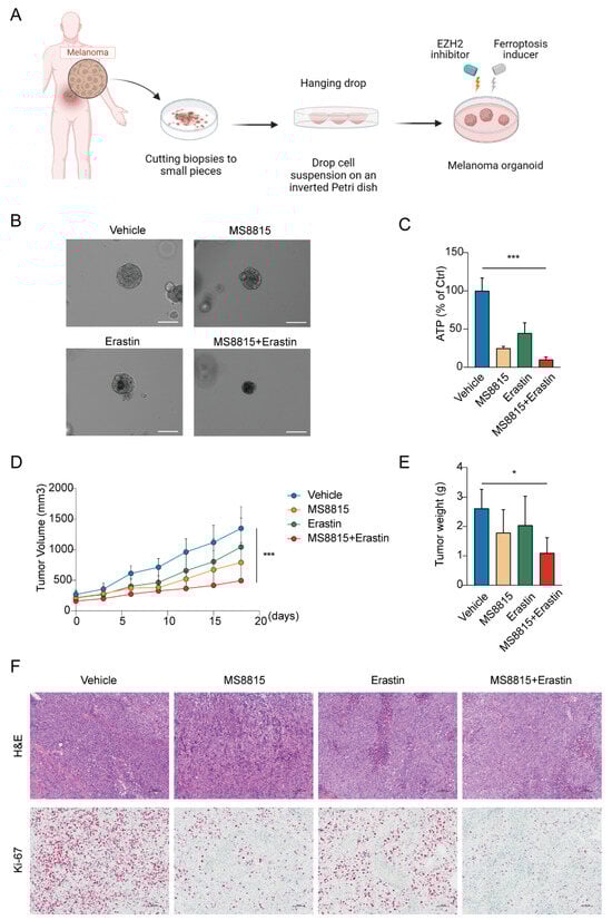Effects of combined EZH2 inhibitor and ferroptosis inducer treatment in MM. (A–C) Evaluation of combinatorial treatment effects on melanoma organoid models. (A) Schematic representation of the experimental design for combinatorial treatment with MS8815 and erastin on melanoma organoid models. (B) Representative images of melanoma organoids treated with DMSO (vehicle control), MS8815, erastin, and a combination of MS8815 and erastin, showing morphological changes (n = 3). Scale bar: 100 µm. (C) Quantification of cellular ATP levels as a measure of cell viability post-treatment (*** p < 0.001 compared to vehicle control). (D–F) Effects of combined MS8815 and erastin on tumor growth in a MM PDX model. (D) Tumor volume was measured over an 18-day period. (E) Tumors were weighed and plotted (n = 5). Data were expressed as mean ± SEM. * p < 0.05, *** p < 0.001. (F) Representative images from H&E and immunohistochemical staining of Ki-67 protein expression. Scale bars: 100 μm.