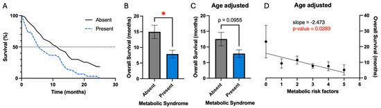 Metabolic risk factors are associated with worsened overall survival. (A) Kaplan–Meier plot demonstrating worsened overall survival in patients with metabolic syndrome. (B) Patients with metabolic syndrome have decreased mean overall survival; * signifies p-value ≤ 0.05. (C) After correction for age as a confounding variable, metabolic syndrome only demonstrates a trend of worsened survival. (D) Accumulation of increasing numbers of metabolic risk factors is associated with worsened survival.