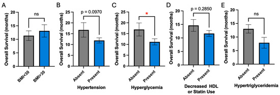 Association of individual metabolic risk factors with overall survival. (A,B,D,E) BMI, hypertension, decreased HDL or statin use, and hypertriglyceridemia are not associated with survival. (C) Hyperglycemia is significantly associated with worsened survival; * signifies p-value ≤ 0.05; ‘ns’ denotes not significant.