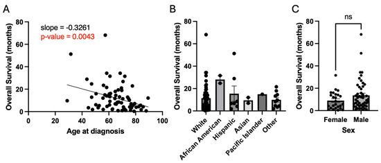 Patient demographics and overall survival. (A) Older age at diagnosis has a directly proportional association with worsened survival. (B,C) Race and sex are not associated with survival; ‘ns’ denotes not significant.