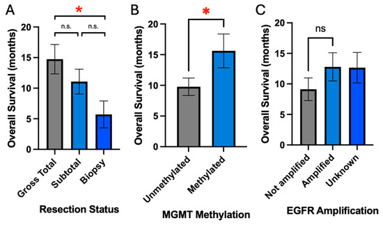 Extent of resection and tumor molecular markers are associated with overall survival. (A) Increased extent of resection is associated with improved survival. (B,C) MGMT methylation but not EGFR amplification is associated with improved survival; * signifies p-value ≤ 0.05, while ‘ns’ denotes not significant.