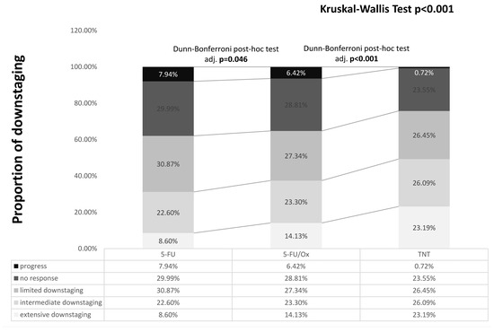 Downstaging after different neoadjuvant treatment. Differences were assessed with the Kruskal–Wallis test and Dunn–Bonferroni post hoc tests. Calculation: post-neoadjuvant tumor stage according to UICC (ypTNM or ycTNM) minus clinical baseline tumor stage according to UICC (cTNM): Progress: >0, No response: =0, Limited downstaging: =−1, Intermediate downstaging: =−2, Extensive downstaging: =−3.