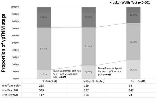 Post-neoadjuvant tumor stage after neoadjuvant 5-FU CRT, 5-FU/Ox CRT, or TNT. Differences were assessed with the Kruskal–Wall test and Dunn–Bonferroni post hoc tests.
