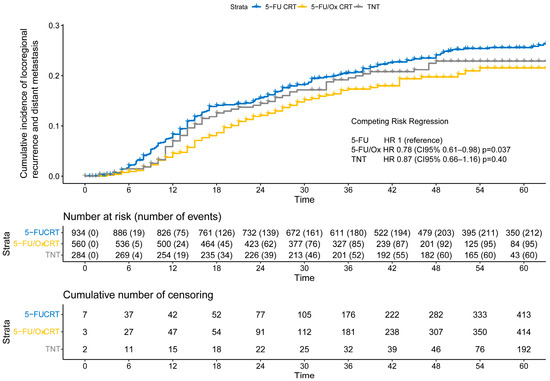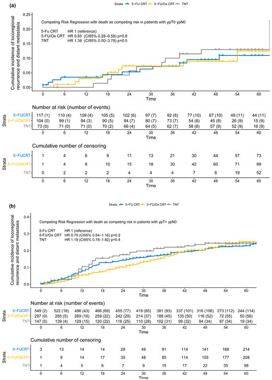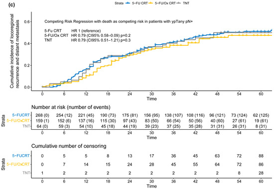 In conclusion, this post hoc cross-trial comparison of patients treated within three randomized clinical trials with neoadjuvant 5-FU CRT or 5-FU/Ox CRT, or TNT showed significant differences in the incidence of TF with death as a competing risk when analyzed by post-neoadjuvant tumor stage or tumor response, but no relative differences when stratified by the intensity of neoadjuvant treatment. An extensive risk of TF, and therefore the need for additional adjuvant treatment after TNT in patients with limited tumor response or ypN+ stage after TNT, cannot be inferred from the data used in this analysis. Without prospective evidence of benefit from additional adjuvant chemotherapy in these patients, we would suggest that surveillance protocols should be more individualized based on the highly significant association between pathological outcome and the incidence of TF.