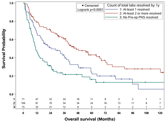 Kaplan–Meier curve for overall survival in patients with RCC by count of paraneoplastic labs resolved by one year.