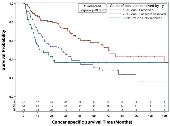 Kaplan–Meier curve for cancer-specific survival in patients with RCC by count of paraneoplastic labs resolved by 1 year.