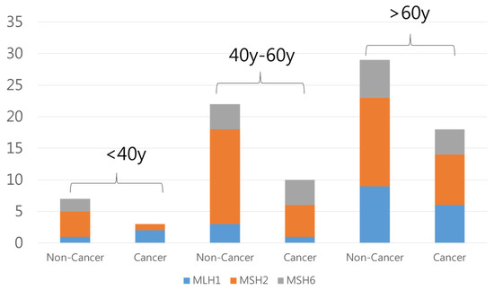 Distribution of MLH1, MSH2, and MSH6 gene variants by age group and cancer status. The distribution of MLH1, MSH2, and MSH6 gene variants among participants in our cohort, stratified by age group (<40 years, 40–60 years, and >60 years) and cancer status (non-cancer and cancer). The vertical bars represent the number of individuals carrying pathogenic variants in each gene, with the color-coded segments indicating the specific gene affected: MLH1 (blue), MSH2 (orange), and MSH6 (gray).