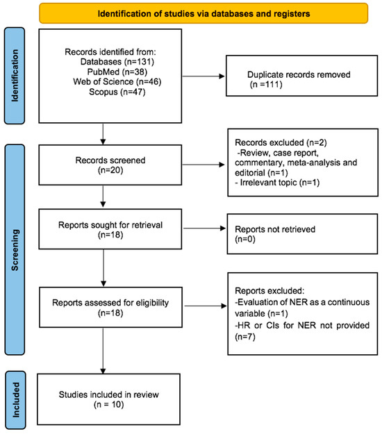 Our initial systematic search yielded a total of 131 records. After removing 111 duplicates, we screened the titles and abstracts of the remaining 20 records. We excluded 2 records due to an irrelevant topic (n = 1) and article type (review) (n = 1). The remaining 18 records underwent rigorous full-text review, and 8 studies were excluded for not meeting eligibility criteria (n = 1 for continuous NER, n = 7 for lack of HR and CIs for survival). Consequently, 10 studies were deemed eligible for quantitative synthesis. Figure 1 presents a detailed flowchart of the article selection process.