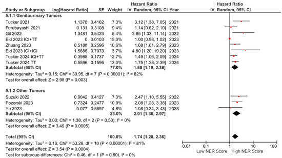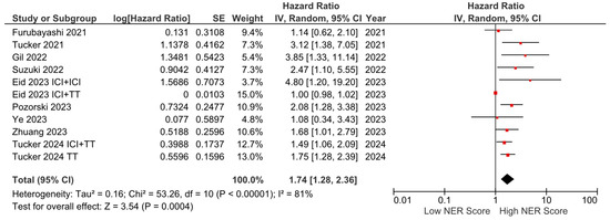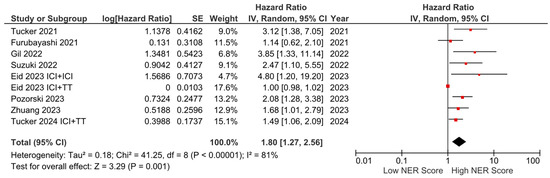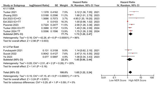 Subgroup analyses for the tumor type (HR: 1.68, 95% CI: 1.19–2.36, p = 0.003 for genitourinary tumors; HR: 2.01, 95% CI: 1.36–2.97, p < 0.001 for other tumors) demonstrated a consistent negative association between high NER levels and OS (Figure 3). Subgroup analyses by study location revealed a similar trend across studies from the USA (HR: 1.73, 95% CI: 1.20–2.47, p = 0.003) and studies from the Far East (HR: 1.45, 95% CI: 0.86–2.44, p = 0.160) (p-value for subgroup differences = 0.590), although the analyses of studies from the Far East did not reach statistical significance (Figure 4). In patients receiving ICI-based regimens (eight studies), a significantly higher risk of death was observed in those with high NER levels compared to those with low NER levels (HR: 1.80, 95% CI: 1.27–2.56, p = 0.001) (Figure 5).