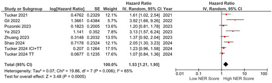 PFS data were available from seven studies and were included in the meta-analysis. The pooled analysis revealed that elevated NER levels were associated with worse PFS (HR: 1.53, 95% CI: 1.21–1.95, p < 0.001). The heterogeneity among studies was moderate, as indicated by an I2 statistic of 65% (Figure 6).