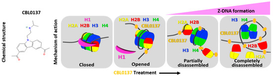 A schematic diagram illustrating the mechanism of action involving chromatin decondensation and the chemical structure of CBL0137. Z-DNA formation occurs following the interaction of CBL0137 with chromatin, leading to histone disassembly.