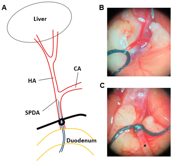 A schematic illustration and representative photographs of HAI via the superior pancreaticoduodenal artery (SPDA). (A) A diagram of the HAI procedure via the SPDA. (B) A representative photograph of the vascular anatomy before cannulation. (C) A representative photograph after catheter placement (*) in the SPDA.