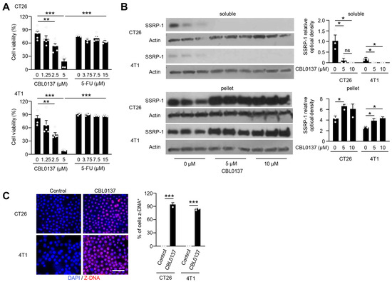 CBL0137 rapidly limits proliferation of CT26 and 4T1 tumor cells in vitro by altering DNA/histone interactions. (A) In vitro cell viability was significantly reduced by a 15 min treatment with CBL0137 as compared to 5FU (n = 5). Representative data among 3 independent experiments. **: p < 0.01; ***: p < 0.001 from Student’s t-test; error bar: standard error of the mean. (B) Western blot analysis of SSRP 1 redistribution after in vitro treatment with different doses of CVB0137. As a marker for CBL0137 activity, SSRP1 loss in the soluble fraction of nuclear proteins and accumulation in the pelleted fraction of proteins from tumor cells was noted in vitro. Representative data between 2 independent experiments. Results were quantified using 1.53v ImageJ. n = 3; *: p < 0.05 from Student’s t-test; error bar: standard error of the mean, ns: not significant. (C) Immunofluorescence (IF) of Z-DNA in cancer cells. CT26 and 4T1 cells were treated with either the control (D5W) or CBL0137 for 15 min in vitro and then were stained with Z-DNA antibodies showing marked induction of Z-DNA formation. Representative IF figures among 3 independent experiments. n = 3; bar is 50 µm; ***: p < 0.001 from Student’s t-test; error bar: standard error of the mean.