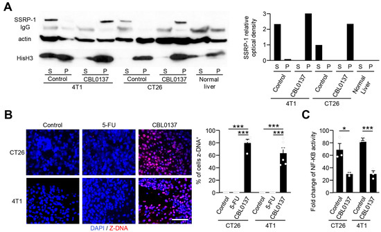 HAI with CBL0137 induces distinct chromatin decondensation with Z-DNA formation in vivo. (A) Western blot analysis of SSRP 1 redistribution after in vivo treatment via CBL0137 HAI. HAI with CBL0137 induced DNA/histone changes as noted by loss of SSRP-1 in soluble fractions and appearance in the pellets of 4T1 and CT26 liver tumors. Single experiment. (B) Z-DNA detection using IF after in vivo HAI. In vivo HAI with CBL0137 induced nuclear changes as depicted by the generation of Z-DNA as compared to control (D5W) or 5-FU. Representative IF figures among 3 independent experiments. n = 6; ***: p < 0.001 from Student’s t-test; error bar: standard error of the mean. (C) Suppression of NF-κB expression 4 h after CBL0137 HAI compared to the control HAI group. Representative data from 2 independent experiments. n = 3, *; p < 0.05, ***; p < 0.001 from Student’s t-test, error bar; standard error of the mean.