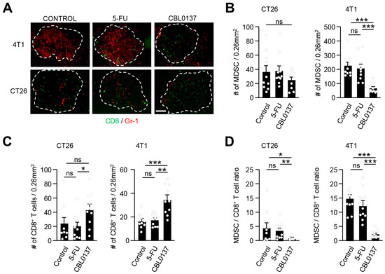 In terms of immune contexture, CT26 tumors are low in MDSCs and are considered immune-responsive while 4T1 tumors have high levels of MDSCs and are resistant to checkpoint inhibitor immunotherapy [50,51,52]. One of the key mechanisms of 4T1 tumors that makes them refractory to immunotherapy is the robust expansion of MDSCs and the subsequent inhibition of CD8+ T cell infiltration [53]. We define MDSCs by a CD11b+Gr1+ phenotype and the ability to suppress T cell proliferation as previously reported [54], with about 80% of the enriched CD11b+ cells co-expressing Gr-1+ with effective T cell suppression (Supplementary Figure S3A,B). Immunogenic CT26 tumors are noted to have minimal MDSC expansion and increased baseline CD8+ T cell infiltration which was evident following control (D5W) HAI (Figure 6A). 5FU HAI did not demonstrate any impact on MDSCs or T cell infiltration in CT26 tumors as compared to the control HAI (Figure 6B,C). CBL0137 HAI did not influence the already low levels of MDSCs found in CT26 tumors (Figure 6B) but did slightly increase the level of CD8+ T cell infiltration in CT26 tumors (Figure 6C), and this was reflected in a significant decrease in MDSC/CD8+ T cell ratios [ratio of 4.5:1 (vehicle) to 0.8:1 (CBL0137)] (Figure 6D). In contrast, liver 4T1 tumors at baseline following control (D5W) HAI have extensive intratumor MDSCs with exclusion of CD8+ T cells (Figure 6A). While 5FU HAI had no appreciable changes in MDSCs or T cells in 4T1 tumors, CBL0137 HAI significantly reduced intratumoral MDSCs (Figure 6A,B) and produced a significant increase in CD8+ T cell infiltration in previously cold 4T1 tumors (Figure 6C). The profound increase in tumor-infiltrating CD8+ T cells could be at least partially attributed to a simultaneous reduction in MDSCs in 4T1 tumors treated with CBL0137 HAI as reflected in the favorable MDSC/CD8+ T cell ratios [ratio of 14.7:1 (vehicle) to 2.2:1 (CBL0137)] (Figure 6D).