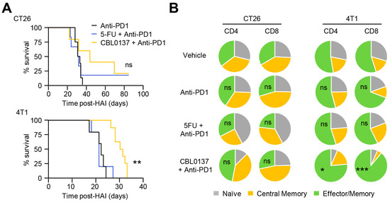 PD-1 blockade therapy augments survival of CBL0137 HAI. (A) Survival curves with anti-PD-1 therapy after HAI. Overall survival was improved, and cures generated by the addition of anti-PD-1 in HAI CBL0137 and 5-FU groups in CT26 tumor-bearing mice. And overall survival was significantly extended by the addition of anti-PD-1 therapy to CBL0137 HAI in 4T1 tumor-bearing mice compared to PD-1 alone. Survival data were acquired after each treatment with mice bearing 4T1 and CT26 liver metastases. Pooled data from 2 different experiments. **: p < 0.01; ns: not significant; n ≥ 5, using log-rank tests. (B) Compositions of CD4+/CD8+ naïve, central memory, and effector memory T cell populations. T cell-activated statuses were analyzed as naïve (CD62L+CD44−), central memory (CM; CD62L+CD44+), and effector memory (EM; CD62L−CD44+) cell populations 5 days after each treatment and showed significant skewing toward effector memory subsets in combined CBL0137 and anti-PD-1 treatment in 4T1 mice. Pooled data from 2 different experiments. *: p < 0.05; ***: p < 0.001; ns: not significant; n ≥ 4, from Student’s t-test.