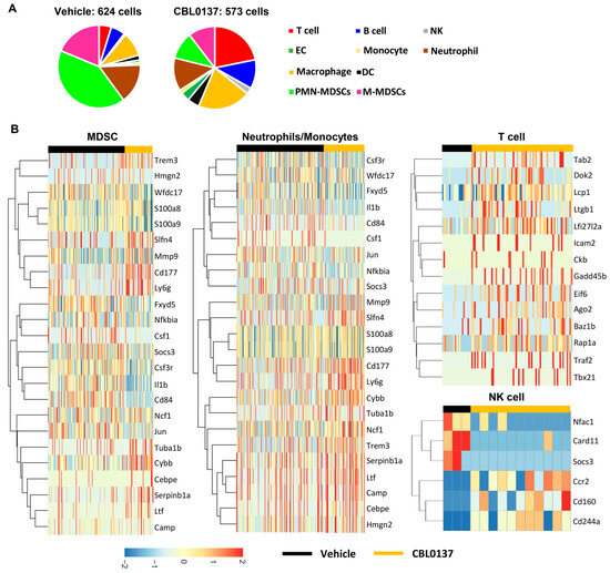ScRNAseq data reveal differences in cell clusters and gene expressions. Isolated leukocytes from the liver 5 days after HAI with either vehicle or CBL0137 were analyzed to (A) characterize cell populations and (B) different gene expressions in MDSCs, neutrophils, monocytes, and T and NK cells.