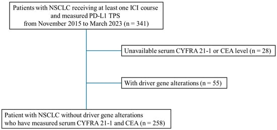 From November 2015 to March 2023, 341 patients with NSCLC received at least one ICI course, and their PD-L1 tumor proportion score was measured. Moreover, 83 patients (28 with unavailable serum CYFRA 21-1 or CEA measurement, and 55 with driver gene alterations (EGFR, ALK, ROS1, RET, BRAF, and MET)) were excluded. Thus, 258 patients were included (Figure 1).