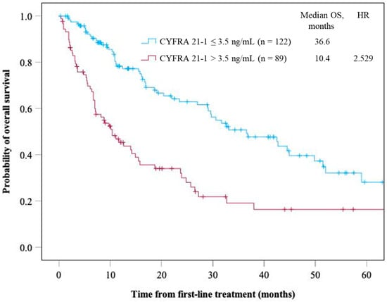 Overall survival of patients with non-squamous NSCLC based on the serum CYFRA 21-1 level. Time is expressed in months.