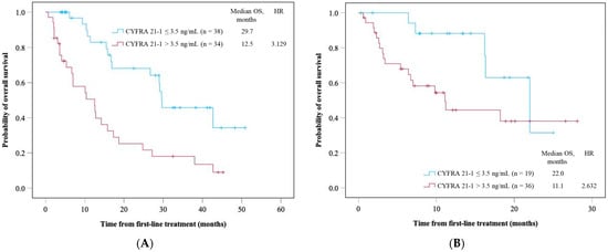 In this study, 72 patients were treated with the anti-PD-1/L1 antibody and chemotherapy combination as first-line therapy. Among them, 34 patients exhibited high serum CYFRA 21-1 levels. The high-serum-CYFRA 21-1 group demonstrated a significantly shorter OS than those in the normal-serum-CYFRA 21-1 group (mOS: 12.5 vs. 29.7 months, p < 0.005) (Figure 4A). The PFS was significantly shorter in the high-serum-CYFRA 21-1 group than in the normal-serum-CYFRA 21-1 group (median PFS: 4.9 vs. 7.7 months, p = 0.034) (Supplementary Figure S1A). Moreover, 55 patients were treated with anti-CTLA antibody combination therapy. Among them, 36 patients exhibited high serum CYFRA 21-1 levels. This high-serum-CYFRA 21-1 group demonstrated a significantly shorter OS than the normal-serum-CYFRA 21-1 group (mOS, 11.1 vs. 22.0 months, p = 0.048) (Figure 4B). The PFS was significantly shorter in the high-serum-CYFRA 21-1 group than in the normal-serum-CYFRA 21-1 group (median PFS: 3.5 vs. 8.1 months, p = 0.236) (Supplementary Figure S1B).