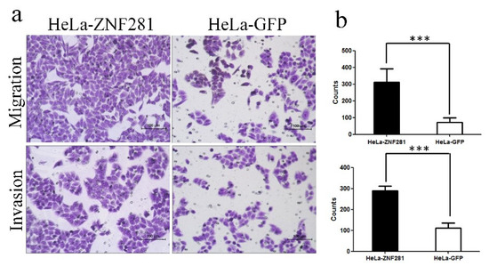 3.4. Effect of ZNF281 Overexpression in HeLa Cell Migration and Invasion